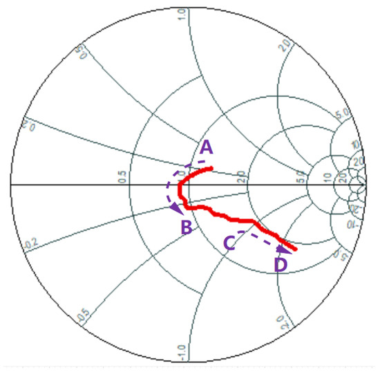 Simulated S11 at P1 of the circulator in a Smith chart (The input power at A is 20 dBm, at B is 30 dBm, at C is 35 dBm, and at D is 40 dBm). A 64.5% power reflection occurs at C, corresponding to S11 = −1.9 dB.