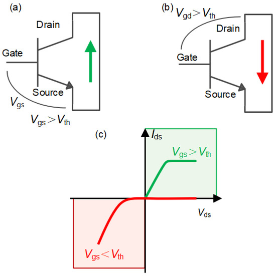 A transistor can be transformed into a rectifier by utilizing its third-quadrant switching characteristic. As depicted in Figure 6a, the criterion for activating the channel in forward conduction (from drain to source, operating in the first quadrant) is that the gate-to-source voltage () must surpass the threshold voltage (). When falls below , current cannot conduct in the first quadrant (the power amplifier operation region). The drain and source can be considered interchangeable when the current conducts in the inverted direction. The condition required to open reverse conduction is the gate-to-drain voltage () exceeding (Figure 6b). The transistor operates based on the characteristics exhibited in the third quadrant, as illustrated in Figure 6c and represented by the red curve.