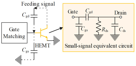 A gate-drive signal is necessary for the self-synchronization of the transistor to achieve autonomous operation as a rectifier without external control and power supply. In previous works, a commonly employed method involved incorporating a sampler with a phase-shifting circuit to generate the required gate signal for the rectifier [22]. However, this approach introduces high complexity in circuit design and increases the overall circuit size. Another method relies on the drain-gate feedback capacitance () inherent in the HEMT, allowing for direct feeding of the RF signal into the gate [23]. This innovative design enables the rectifier to achieve self-synchronization without the need for an external feedback loop. The operating principle of an HEMT-based rectifier is described in Figure 7. When the transistor is considered a switch and RF input power is applied to the drain node, a gate-switching signal is generated through . Consequently, the RF input undergoes rectification by the gate-switching signal.