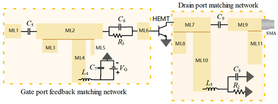 Circuit topology of the realized matching network of the HEMT-based rectifier.