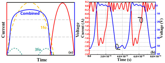 Class-F time-domain current and voltage waveforms: (a) ideal half-rectified sine wave and square voltage waveform obtained by managing the odd harmonic; (b) simulated waveforms at 2.4 GHz (the RF input power at the drain is 41 dBm).