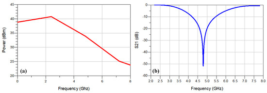 Simulated HEMT power amplifier operation characteristics: (a) output power of 41 dBm at 2.4 GHz; (b) drain output matching network S21 versus frequency.