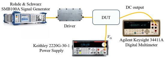 The measurement setup is shown in Figure 13. The 2.4 GHz RF input power is generated by a Rohde & Schwarz SMB100A. Due to the limited power of the signal output from the generator, the signal is amplified through a driver, then fed into the device under test (DUT). A Keithley 2220G-30-1 supplies the to enable HEMT-based rectifier operation. The resulting DC output voltages across two load resistances, namely and , are measured using an Agilent Keysight 34411A digital multimeter. The efficiency of the RF-to-DC conversion is determined by the following expression: