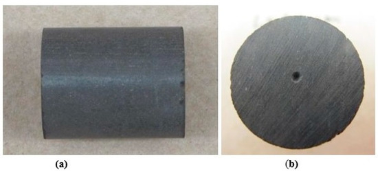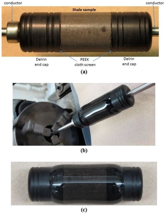 The rock samples were right circular cylinders, nominally 2.54 cm in diameter, recovered from a shale gas reservoir (Figure 1a). The samples were cored parallel to bedding planes, producing three length sets (~3.1, ~6, and ~9 cm), which were incorporated into the design of the internal fixturing for the sample assembly. A small cone was machined in the center of each end of a sample (Figure 1b) to fit the mated piece of the conductor/flow transmission end (Figure 2) to enhance electrical contact. After receiving the core samples, they were refrigerated at 7.2 °C in their original shipping containers (plastic jars). Samples were later removed from the shipping containers, unwrapped, and jacketed for a few days to two weeks prior to testing to minimize the potential for handling damage and to complete the CT scans in advance of testing.