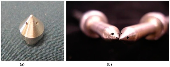 (a) Cone shaped conductor end with flow holes; (b) cone shaped conductor ends brazed into conductor/flow tubing; used/worn (left) and new (right).