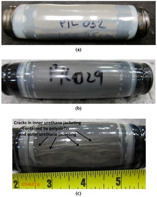 Shale sample jacketed with (a) polyolefin over inner urethane; (b) urethane over polyolefin; (c) deformed sample demonstrating jacket integrity post-test.