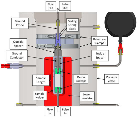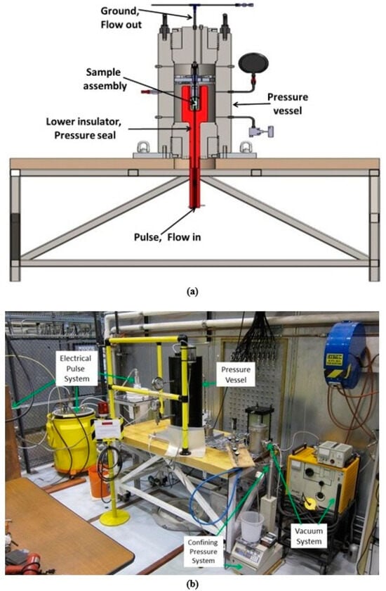 The jacketed sample was placed inside the sample holder. The two-piece Delrin holder allowed the jacketed sample to be handled in and out of the vessel without disturbing the sample before or after testing (Figure 5). The sample assembly was loaded into the pressure vessel, which sat atop the lower conductor that was mounted on top of a wooden table (Figure 6a) as part of the laboratory setup (Figure 6b). The lower retention clamp was inserted and fastened atop the outside spacer. The spacer between the retention clamps allowed for centering of the ground electrode, which was pre-fastened to the upper vessel closure. The sample holder contained springs to press the sample against the electrode (Figure 5). The high-pressure metal tubing was used as both the electrical conductor for high voltage and the conduit for helium gas for permeability determinations; the Delrin sample end caps doubled as an electrical insulator and sliding high-pressure seal. The Delrin sample holder also provided electrical insulation and served as part of the high-pressure seal in combination with O-rings between the inside of the pressure vessel and the ambient environment.