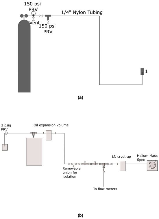 A wide dynamic range for the permeability measurements was necessary for this study. Transient pressure pulse (falling head) techniques can quickly measure low permeability values; however, these techniques would not be suitable for fractured samples with high permeability. Thus, permeability was measured with a steady-state gas flow (constant head) using a combination of helium leak detector or flow meters with sensitivity ranges between 10−10 cc atm/s and 102 cc atm/s [14,15,16]. Helium was selected as the flowing gas due to its small molecular size, relatively low viscosity, and its ability to be used with helium leak detector mass spectrometers to provide ultra-low mass flow detection.