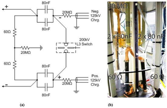 The high-voltage pulser used for these experiments was customized to deliver a 6.5 μs full width at half maximum (FWHM) voltage pulse up to 200 kV into a high-impedance load. Figure 8 depicts the pulser architecture (schematically Figure 8a, and internal components (Figure 8b)), which utilized four 80 nF capacitors erected in two parallel pairs to provide a total capacitance of 80 nF. The maximum electrical energy stored in the capacitors was E = 0.5 × CV2 = 1600 J, where C is capacitance and V is voltage. The pulse shape was achieved using two 60 Ω pulse forming resistors (nominal) and delivered to the experiment through two 3.5 m single-core insulated cables spaced by 0.1 m separators. The positive output cable of the pulser was attached to the helium-filled central electrode and the negative cable was attached to the base of the pressure vessel. Each electrode was conical (Figure 2) with 45° full angle and 6.4 mm initial diameter. The samples were machined with a 0.2 cm deep mating seat to increase the electrical contact area.