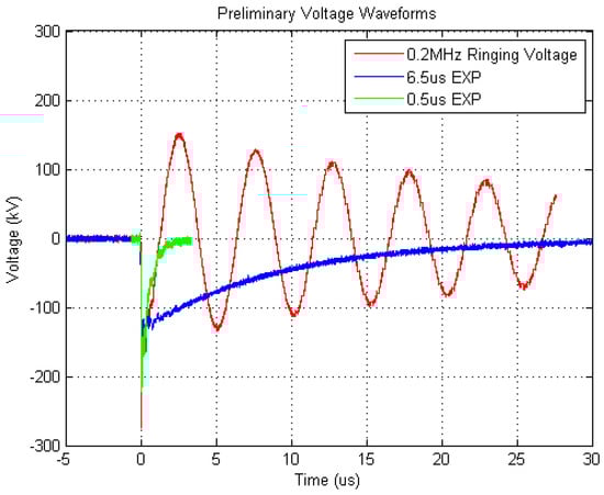 An initial set of experiments were performed using plastic, shale, limestone, and slate as part of the process of customizing the test systems to establish an effective voltage pulse shape and synchronization [17]. These experiments were performed at atmospheric conditions to test the system functions and ensure the system could fracture rock at ambient pressure. These tests allowed us to obtain initial estimates of experimental parameters such as: (1) charge voltage scaling as a function of sample length; (2) number of pulses necessary to achieve fracturing; (3) impact of electrical pulse shape on fracturing; and (4) sample jacket thickness required to maintain separation from oil and maintain jacket integrity during fracturing. The three voltage waveforms involved in the evaluation were 0.2 MHz ringing, 6.5 μs FWHM exponential, and 0.5 μs FWHM exponential waveforms (Figure 9). The results of this preliminary evaluation revealed that the 6.5 μs FWHM voltage pulse had the most favorable scaling for longer sample lengths, thus it was decided to operate in the range of 160 kV to 200 kV.