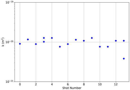 Once the initial flow rate had stabilized, flow rate and inlet pressure were recorded, and permeability was calculated using Equation (3) assuming the outlet pressure was equal to zero for vacuum conditions. Permeability was measured after varying the shot sequences during and after the testing. In some instances, permeability was measured in between single shots. During these intermediate measurements, flow was allowed to stabilize for one hour before recording and moving on to the next shot. If a sample was not fractured by the end of the day, the permeability measurement was allowed to flow overnight. Before the initial measurement and throughout the testing procedure, the helium leak detector was calibrated using a calibrated leak. An aluminum core with 20.7 MPa confining pressure was used to measure the line blank for the system using the exact protocol above. The permeability detection level was determined to be 7 × 10−25 m2, which is several orders of magnitude below all but one sample permeability.