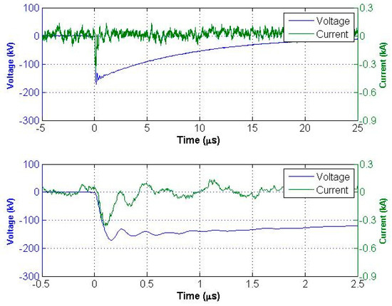 Exponentially smoothed voltage and current waveforms for the first PIL-037 (3 cm) shot at 160 kV: the full-time history (top) shows the noise level on the current signal; the narrow time window (bottom) shows a 300 A current during the initial voltage surge.
