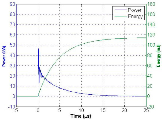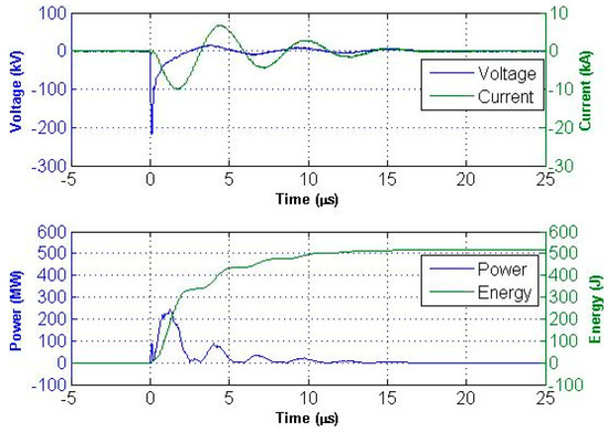 and the energy is an integration of the power waveform with the total energy being the last data point. The total energy for each of the six non-breakdown shots at 160 kV were ~100 mJ. This energy is used as the lower bound for the actual energy deposited into this sample prior to the breakdown shot. The total energy stored in the capacitors during each of these shots was E = 0.5 × CV2 = 1.0 kJ. This value is used as the absolute upper limit of energy deposition. The calculated energy found by integrating the absolute value of the power waveform created by the product of the voltage and current, , is a reasonable upper bound for energy deposition during non-breakdown shots.