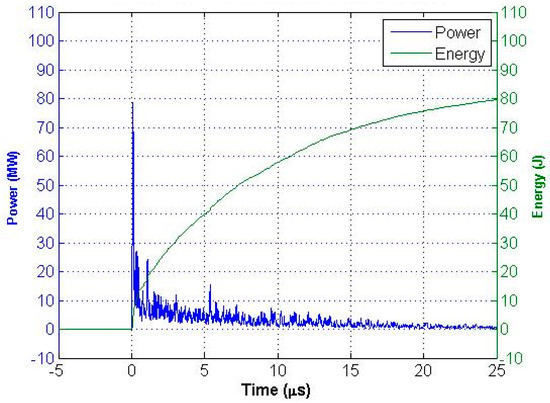 The power and energy waveforms of the first shot of PIL-037 are shown in Figure 12 using a constant 1 MΩ impedance approximation to be conservative. The power was calculated by: