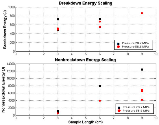 Energy values for each pressure: the final breakdown shot (top) and cumulative non-breakdown shots (bottom).