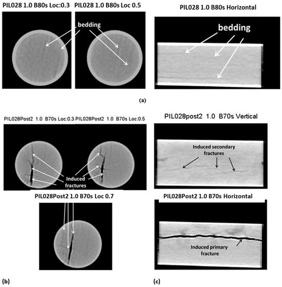 (a) Sample PIL-028, length = 6 cm, Pc = 20.7 MPa (3000 psi). Pre-test exhibits fine laminar bedding evident both perpendicular (left) to the core long axis and parallel (right) to the core long axis. (b) Post-test deformation perpendicular to the core long axis along its length, showing primary fractures parallel to bedding and secondary fractures oblique to bedding. (c) Post-test deformation parallel to the core long axis along orthogonal diameters along its length, showing primary fractures parallel to bedding (bottom) and secondary fractures oblique to bedding (top).