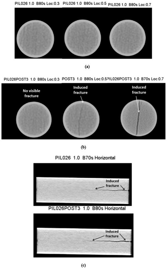 (a) Sample PIL-026, length = 9 cm. Pc = 58.6 MPa (8000 psi). Pre-test exhibits fine laminar bedding evident perpendicular to the core long axis. (b) Post-test perpendicular to the core long axis along its length, showing fracture absent, then a thin fracture, then a wider fracture (left to right). (c) Post-test deformation parallel to the core long axis along diameters from different scans, showing fracture at the right side of the sample and disappearing near the sample center.
