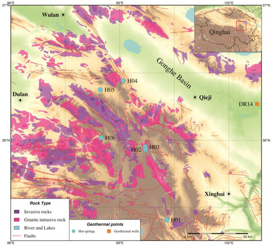 Along the WWFZ, there are hot springs such as H01 (31–64 °C, Wenquan Township, Xinghai County), H02, H03 (65–78 °C, Sangchigou, Xinghai County), H04 (35–46 °C, Bayinggeli), H05 (67 °C, Angutan, Dulan County), and H06 (87 °C, Reshuigou, Dulan County). These hot springs are located at the intersection of different fractures (Figure 1). Most of these hot springs are in a primitive and undeveloped state, except for the H01 hot spring, which is currently under construction with related tourism and sanatorium facilities for tourists to bathe.