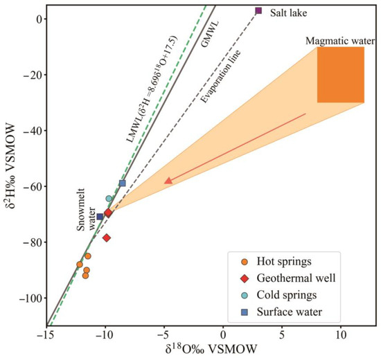 Hot springs are generally derived from meteoric water, and there is a depth effect in the infiltration process of meteoric water in the fracture zone, i.e., the δ2H and δ18O contents in hot water decrease with increasing depth. In the deep high-temperature environment, the hot water interacts with the surrounding rocks, resulting in “oxygen drift”, which increases the δ18O content. Therefore, according to the hot springs’ isotopic composition, we can analyze underground hot water’s circulation process, recharge rate, and geological events (water–rock interactions) encountered in the fracture zones, as well as support the analysis of the fracture zones’ controlling role on the geothermal system. The stable isotope δ2H -δ18O relationships for geothermal wells, cold springs, salt lakes, rainwater, and snow water in the Gonghe Basin neighboring the WWFZ were analyzed for comparison (Figure 3). All of the collected water samples showed hydrogen and oxygen stable isotopes falling around GMWL and LMWL [41], suggesting that the recharge source is meteoric water. The δ2H and δ18O values of the hot springs in the WWFZ are significantly smaller than those of other water bodies within the Gonghe Basin, suggesting that the hot water in the study area is derived from meteoric water at higher elevations, or from meteoritic water in colder climates. The WWFZ is located in the Elashan Mountains with an average elevation 4500 m, in combination with the topography. The δ2H and δ18O values gradually decrease with rising elevation, making the δ2H and δ18O values significantly smaller than those of other water bodies neighboring the Gonghe Basin. A map of the possible extent of magma water genesis (Figure 3), based on stable isotope intervals between ice-melt water and magma water in the area, reveals that there is no magma-influenced hot water in the area. The weak oxygen drifts in H01 and H02 suggest that water–rock interactions occur at hot water depths, which is in accordance with the Gibbs diagram results.