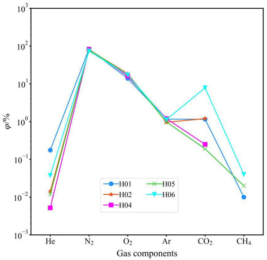 The gases in hydrothermal areas (Table 3) can be broadly categorized into two types in the Tibetan Plateau according to their composition and genesis: CO2-type gases, which have both magmatic hot water and deep circulation genesis, and N2-type gases, which have only deep circulation genesis [43]. The gas concentration data (Figure 4) show that the major composition of all hot water is N2. The mean N2 concentration value is >80%, belonging to the N2 type of gas, indicating that the genesis type of hydrothermal activity in the WWFZ belongs to the deep circulation category. In the samples, H2, H2S, and SO2 were undetectable due to their low concentrations. Higher levels of O2 were found in hot spring water samples at higher temperatures, likely because atmospheric oxygen dissolves in the hot water as it rises. However, the contamination of the samples due to unregulated operation during sampling cannot be excluded. Atmospheric composition was not adjusted in this study to accurately characterize the area of hydrothermal activity. Most of the samples had relatively low CO2 concentrations, averaging only 0.7%, except for sample H06, which had a relatively high CO2 concentration of 7.83%.