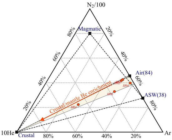 Nitrogen (N2) consistently appears as a major component in low- to medium-temperature geothermal systems. Nitrogen exhibits limited geochemical activity and possesses chemical stability akin to noble gases. Prior to the replenishment of geothermal water by meteoric water, N2 in geothermal gases, along with Ar, is thought to originate from dissolved air. Following prolonged runoff in a reducing environment, the depletion of oxidizing gas components, such as oxygen, leads to the accumulation of rare gas components like nitrogen and argon, which become the dominant constituents [44]. Giggenbach and Glover He–Ar–N2 diagrams show (Figure 5) that the N2/Ar values of all samples fall within the interval between the meteoric water value (38) and the atmospheric value (84) and are closer to the atmospheric value (84), indicating that the N2 component in the hot springs is dominated by atmospheric genesis [45]. The presence of helium (He) primarily stems from the radioactive decay of uranium and thorium within the Earth’s crust [46]. However, it cannot be ruled out that certain samples (such as H01) are in proximity to the helium end, typically associated with mantle origins, hinting at the potential presence of a minor mantle component in these samples. Seismic profiles along the Gonghe Basin–Yushu highway indicate vertical stacking of high- and low-velocity crustal bodies in Wenquan Township, with the Chabcha area and the LVB buried at depths of 15–43 km and with S-wave velocities below 3.4 km/s [47]. Recently, scholars studying the seismicity of the Gonghe Basin in light of deep hot dry rock exploration generally attribute the phenomenon to a young (Quaternary) intrusion of mantle-derived melt into the crust [48,49,50,51]. Therefore, the release of gases from the melt offers the potential for the occurrence of mantle-derived helium in surface hot springs.