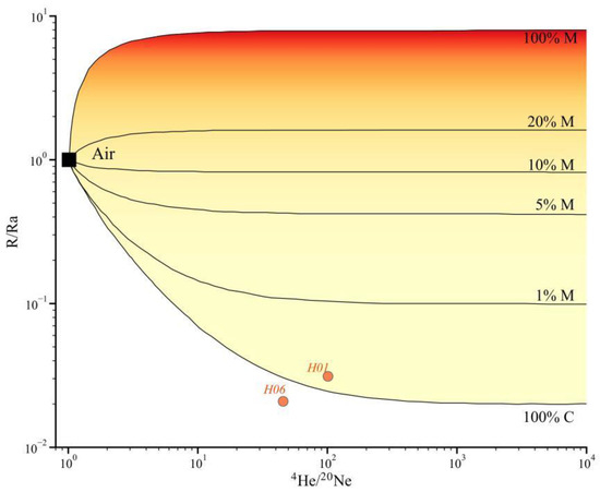 The subscripts A, M, and C represent atmospheric, mantle, and crustal sources, respectively, and fA, fM, and fC represent the proportions of the three sources in the gas samples, of which (3He/4He)A = 1.4 × 10−6, (3He/4He)M = 1.1 × 10−5, (3He/4He)C = 1.5 × 10−8, (4He/20Ne)A = 0.318, (4He/20Ne)M = 1000, and ( 4He/20Ne)C = 0.1000. The results are shown in Table 2. The helium content in samples H01 and H05 primarily originates from the α-decay of 238U, 235U, and 232Th in the crust’s natural radioactive systems, accounting for over 97% on average. A plot of the 3He/4He-4He/20Ne relationship of the geothermal gases in the study area is shown in Figure 6, and the He isotope R/Ra values (ratio relative to the atmosphere) of the hot-water gases in these two locations belong to the crustal helium domain (<0.05), indicating that they are predominantly crustal in origin.