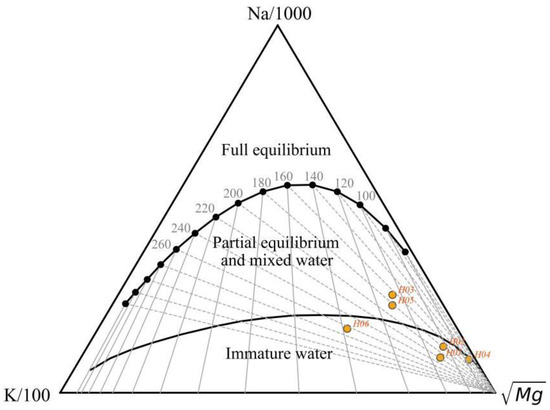 The Na–K–Mg triangulation diagram, proposed by Giggenbach in 1988, categorizes water samples into fully equilibrated, partially equilibrated, and immature water regions, serving as a common tool to evaluate water–rock equilibrium and differentiate between different types of water samples [55]. The Na, K, and Mg concentrations of various hot springs in the study area were plotted on the Na–K–Mg equilibrium triangulation diagram (Figure 7). Four hot springs were identified in the immature water region at the apex of the lower-right corner, suggesting they are in the initial stage of water–rock interaction. Two hot springs, H03 and H05, were observed in the partially equilibrated or mixed water region, signifying ongoing adjustments in the ionic equilibrium between water and rock. Dissolution continues to occur, or the hot water may have undergone mixing with shallow cold water during its ascent. Moreover, examination of the Na–K–Mg equilibrium triangulation diagram indicates that the geothermal reservoir temperatures of all hot spring sites fall within the range of 120 °C to 270 °C. Notably, H06 exhibits the highest potential geothermal reservoir temperature, aligning with the highest temperature recorded in its spring water.