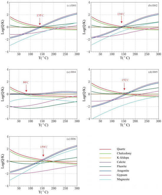 Based on the hydrochemical data, we calculated each mineral’s saturation index at different temperatures. We plotted the log(Q/K)–T curve (Figure 8) using the temperature and log(Q/K) values as horizontal and vertical coordinates, respectively. Based on the data from the petromineralogical investigations in the study area, we made a choice of 11 common minerals: quartz (Quartz), chalcedony (Chalcedony), potassium feldspar (K-feldspar), calcite (Calcite), fluorite (Fluorite), aragonite (Aragonnite), gypsum (Gypsum), and magnesite (Magnesite), and plotted their log(Q/K)–T curves (H02 and H03 are located in the same geothermal field, and only the higher-temperature H02 hot spring was calculated). Among them, the curves of H01, H02, H05, and H06 converged a certain temperature, and their geothermal reservoir temperatures were 135 °C, 139 °C, 152 °C, and 159 °C, respectively. The curve of H04 is more dispersed, and its geothermal reservoir temperature was about 80 °C. H06 has the highest geothermal reservoir temperature among all of the hot springs, which is consistent with the highest temperature of its spring water.