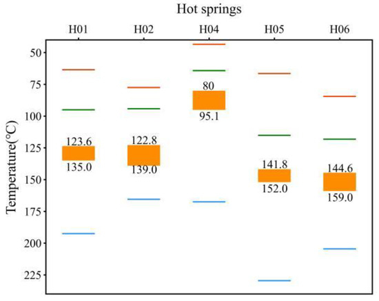Geothermal reservoir temperatures of different hot springs obtained by different methods. Orange bars show geothermal reservoir temperature ranges as determined by quartz geothermometers (no vapor loss) and the multi-mineral saturation index method; blue lies illustrate geothermal reservoir temperatures derived from mixed silicon enthalpy models; the green lines indicate the geothermal reservoir temperature obtained from the chalcedony geothermometer; and the red line shows the temperature of the hot springs at the surface.