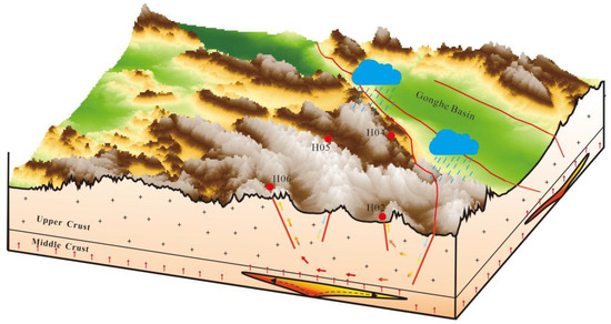 To summarize, under normal or high regional thermal background, Elashan Mountain ice-melt water or meteoric water seeps down through the fracture network or fracture zone of the main fracture of the WWFZ, and runs off to the depths driven by the difference in the hydraulic head, with a gradual increase in temperature at depth; the groundwater continuously draws heat from the surrounding rocks to form geothermal water, and then rises up to the surface due to the difference in density, and is exposed in the appropriate tectonic part (generally at the intersection of two sets of fractures) to form hot springs. Some of the hot springs have a shallow circulation depth and short runoff path, and are exposed in the secondary fractures near the main fracture of the WWFZ, with a lower temperature (H04); meanwhile, the hot springs farther away from the main fracture (H06) have the highest spring water temperature and geothermal reservoir temperature, and their hydrochemistry type is Cl−Na, and the TDS is nearly twice as high as that of the hot springs near the main fracture zone, reflecting their longer runoff path, deeper circulation depth, and the controlling effect of the main fracture and its secondary fractures of the WWFZ on the geothermal system in the area.