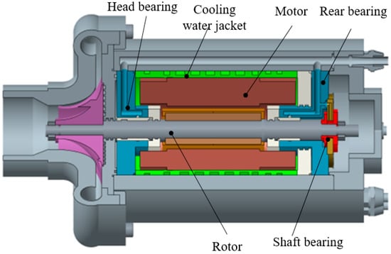 A high-speed permanent magnet synchronous motor in this paper is designed for an air compressor of a hydrogen oxygen fuel cell. The horizontal arrangement of this machine is shown in Figure 1. To minimize friction loss on the bearing, the rotor is supported by a water-lubricated bearing, with a thrust bearing positioned at the rear end. Compared with mechanical bearings, water bearings can not only realize the non-contact support of the rotor, but can also cool the bearing. Compared to other non-contact supports, such as magnetic bearings, water bearings are low-cost and simple to achieve without the need for additional controllers. Therefore, water bearings have become one of the best ways to support high-speed motors. Additionally, to prevent the overheating of the high-speed motor, a cooling water jacket is arranged outside the motor stator to facilitate the water cooling of the machine. Furthermore, provision has been made for motor wiring within the equipment shell to accommodate space for wiring of the motor controller.