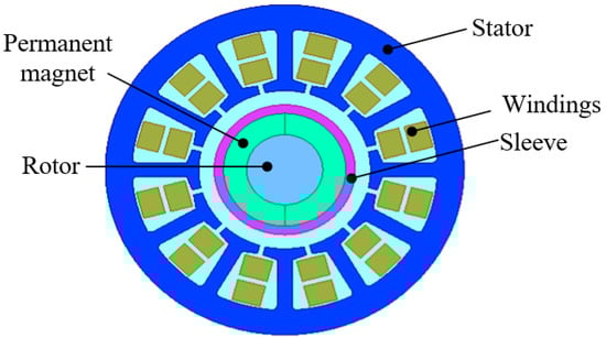 The axial cross-section of the high-speed PMSM is illustrated in Figure 2. In the case of a high-speed PMSM, an increase in pole pairs leads to a rapid rise in stator loss due to the high rotational speed, which may result in unacceptable heat generation. Therefore, the high-speed motor in this design adopts a one-pair pole structure, and the permanent magnet can adopt an integral structure. This motor structure offers advantages such as a low alternating frequency of magnetic field, low stator iron loss, and ease of processing. To prevent damage to the permanent magnet from centrifugal force at high speeds, a protective sleeve covers the outer part of the magnetic steel with an interference fit between them. The stator utilizes a 12-slot structure and is made using 20WTG1500 (laminated) material to reduce eddy-current effects. The winding connection mode is a double-layer short-distance star connection in order to minimize the influence of the skin effect by winding each turn in parallel with multiple strands.