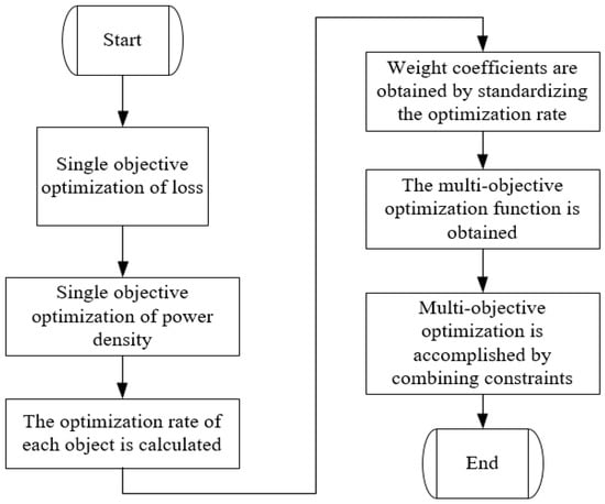 Power density maximization is the second optimization objective. Maximizing the power density is equivalent to minimizing its reciprocal. If each target is assigned a weight coefficient separately, the final objective function is expressed as