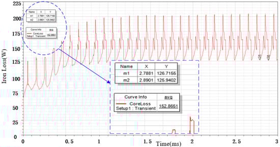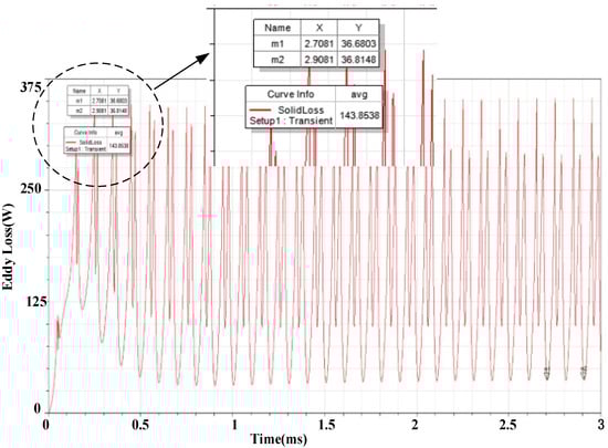 The magnetic vector potential of each node in the model can be calculated. Thus, the current density and eddy current loss can be obtained by FEM. The waveform of the loss at a speed of 10 krpm is depicted in Figure 4. As shown in Figure 4, the eddy current loss amounts to 143.9 W.
