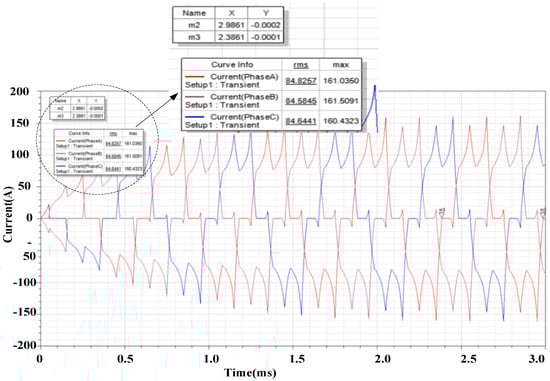 The simulation wave of the three phase currents is shown in Figure 6. The effective value of the phase current is 85 A, whereas the maximum value of the phase current is 160 A.