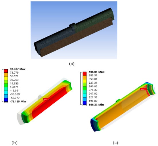Stress simulation results. (a) Mesh plot; (b) Stress simulation of permanent magnet; (c) Stress simulation of sleeve.