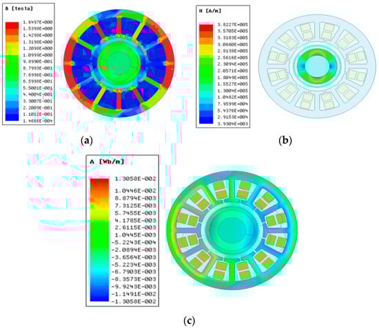 The magnetic field strength of PM is shown in Figure 8b. The maximum magnetic field strength is 382.27 KA/m, which is far less than the demagnetizing magnetic field strength of 910.5 KA/m of magnetic steel. The distribution of the magnetic field lines of the motor is shown in Figure 7c. It can be seen from Figure 8c that the distribution of the magnetic field lines is regular and the magnetic flux leakage at the end is not obvious.