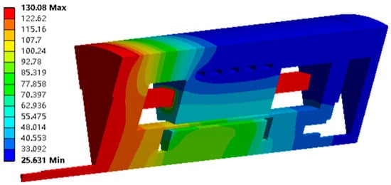 It can be seen in Figure 9 that the highest temperature is located at the left end of the motor cover. This can be attributed to the fact that the left side of the motor is connected to the turbine. During the high-speed rotation of the motor, the turbine generates elevated temperatures, resulting in a corresponding increase in temperature at the left end cover of the motor. This represents the highest temperature among all parts of the motor. Specifically, it was found that the winding reached a maximum temperature of 127 °C, while magnetic steel reached a maximum temperature of 92 °C.