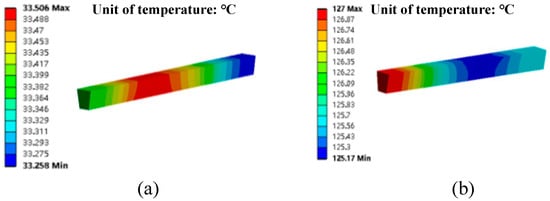 The temperature simulation of the motor winding at various speeds was conducted. The temperature distribution of the motor winding is depicted in Figure 10. It can be seen in Figure 10a that when the rotating speed is 20 krpm, the highest temperature of the winding occurs in the middle. This phenomenon can be attributed to the lower temperature of the spiral case at the front end of the motor when the rotating speed is low, with most heat being generated from the winding itself. The middle section of the winding is insulated equivalently, while both ends are directly exposed to air, resulting in good heat dissipation conditions. In Figure 10b, it is evident that at a rotating speed of 100 krpm, the highest temperature of the winding occurs in the front end. With the increase in the rotating speed, the temperature of the spiral case at the front end of the motor increases, resulting in the increase in the ambient temperature at the front end of the winding, so the temperature at the front end of the winding is higher.