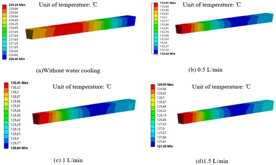 For high-speed motors, a reliable cooling system is crucial. This paper utilizes the water-cooling method. The cooling water flow was set in the range of 0~1.5 L/min to analyze its effect on the temperature of the motor winding. Temperature simulation analysis results conducted for the motor winding are presented in Figure 11. It can be seen from Figure 11a that without a water-cooling system, the motor winding temperature reaches as high as 229 °C. The temperature distribution cloud diagram of motor windings at 0.5 L/min, 1 L/min, and 1.5 L/min water flows are shown in Figure 11b, Figure 11c, and Figure 11d, respectively. It can be seen from Figure 10 that as the flow rate of cooling water increases, the cooling effect improves, and the motor winding temperature decreases. However, the decrease in motor winding temperature gradually stabilizes. From a water-free cooling system to a 0.5 L/min cooling water flow, the motor winding temperature reduces from 229 °C to 133 °C, representing a reduction of 42%. When the cooling water flow increases from 0.5 L/min to 1.5 L/min, the motor winding temperature only decreases from 133 °C to 129 °C, indicating a mere reduction of 3%. It is evident that when the cooling water flow reaches above 0.5 L/min, there is no significant decrease in the motor winding temperature. Therefore, it is essential to ensure that the water flow of the motor cooling system reaches a minimum of 0.5 L/min during operation.