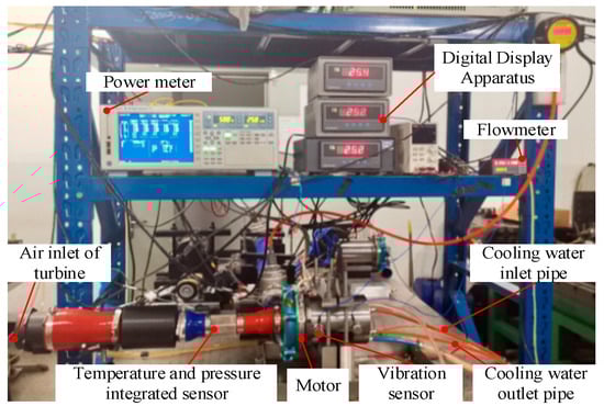 Temperature rise is a crucial indicator of motor performance, reflecting the loss of each component. The experimental setup for motor testing is illustrated in Figure 12 and consists of five main components: a constant voltage DC power supply cabinet, controller, water supply system, motor, and turbine. Power meters are utilized to measure the voltage, current, and power of the motor. Additionally, three temperature sensors work in conjunction with a digital display instrument to measure the temperature of the motor winding, spiral case, and bearing water. Vibration sensors monitor the vibration during motor operation, while integrated temperature and pressure sensors gauge the pressure and flow within the compressor chamber.
