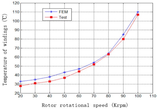 It can be seen from Figure 13 that as the speed increases, so does the temperature of the motor winding. Furthermore, higher speeds result in faster temperature rises. At a speed of 100 krpm, the maximum temperature recorded for the motor winding was 109 °C, which was lower than the temperature resistance limit of winding 180 °C. The error between the measured and simulated temperatures is greater at lower speeds but decreases as speed increases. Throughout all working speeds, both the absolute and relative errors between the design and experimental values for winding temperatures did not exceed 5 °C and 10%, respectively.