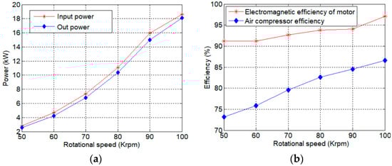 It can seen from Figure 14a that as the speed increases, there is a corresponding increase in both the input power and the electromagnetic power of the motor. This also leads to an improvement in the efficiency of both the air compressor and the electromagnetic power of the motor. When the motor speed reaches 100 krpm, it is capable of achieving an electromagnetic power output of 18 kW, with an electromagnetic efficiency rating of 97.01%. Additionally, the air compressor efficiency is measured at 86.6%. Consequently, the motor successfully meets the designated design requirement.