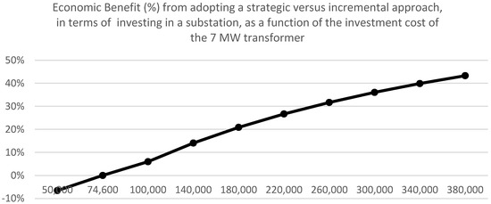 In particular, the vertical axis of this figure shows the economic benefit accrued from investing in the primary substation according to the strategic approach against the incremental approach. The horizontal axis shows the investment cost of the 7 MW transformer of the primary substation. It can be seen that as the investment cost of the 7 MW transformer reduces, the cost of the incremental approach reduces as well, while that of the strategic approach stays the same at GBP 800,000. Hence, the cost difference between the two strategies drops. This means that it becomes less attractive to invest according to the strategic investment approach. That is, the economic benefit accrued from investing strategically reduces as can be seen in the numerator of Equation (3) above. Moreover, in Figure 4 it can be seen that there is a value for the investment cost on the horizontal axis where the economic benefit becomes equal to 0%; this value is at GBP 74,600. For values of the investment cost that are less than GBP 74,600, the economic benefit (%) becomes negative, meaning that investing incrementally is the economically beneficial approach.