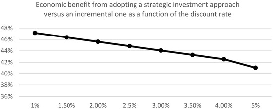 Regarding the discount rate, Figure 5 shows the relationship between the discount rate, shown on the horizontal axis, and the economic benefit accrued from investing in the primary substation, according to the strategic approach against the incremental one. In particular, Figure 5 shows that as the discount rate increases, the economic benefit, shown on the vertical axis, reduces because the cost of the incremental strategy decreases, making the strategic approach less attractive to adopt. However, unlike the previous case (Figure 4) there is no point where the economic benefit becomes negative. Also, notice the values on the vertical axis (the economic benefit) vary much less than those in Figure 4. This means that the discount rate is of less significance as a factor in affecting the economic benefit of investing strategically.
