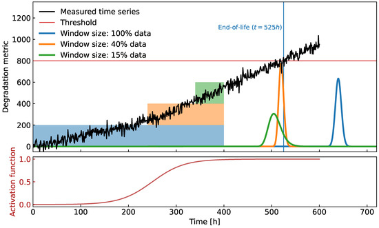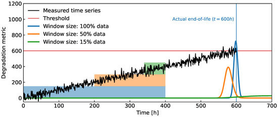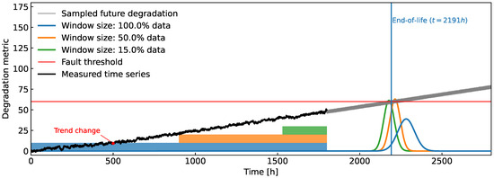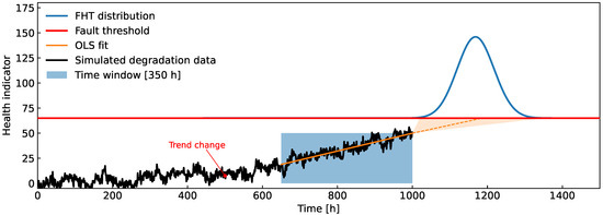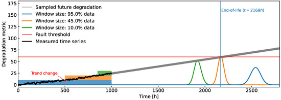 It is important to stress that in this paper it is tacitly assumed that the indicator increases together with the degradation level, i.e., it should have a positive trend. In cases of a high noise level combined with a short time window, the slope of the estimated local trend model at time might turn negative. In that case, the intersection (11) occurs at , which is not a feasible solution and is therefore discarded.