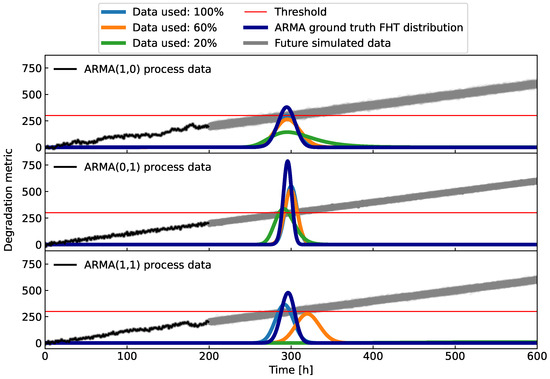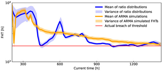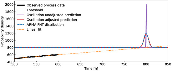 In Figure 8 and Figure 9, the simulated ARMA process with a change in trend is depicted for two examples. The first example has the data from h available and for the second one, we use h. The change in trend is initiated around h for both examples. For the data interval up to about h, the slope of the trend is , which changes to afterward. The resulting FHT distributions derived from different data windows are illustrated in Figure 8 and Figure 9. An obvious improvement in the quality of prognosis can be observed after incorporating only the data after the trend change.
