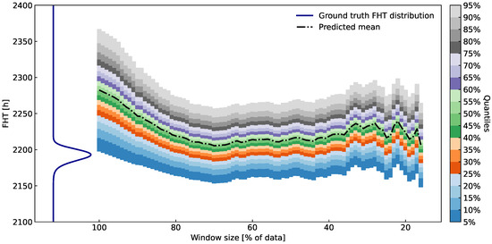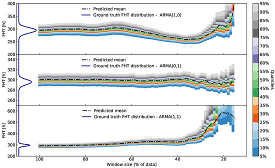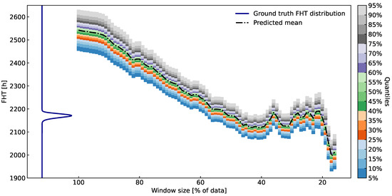 In Figure 10 and Figure 11, we show quantiles of FHT distributions from local trend models obtained from differently sized windows on the data. For example, a window h includes of the data up to 1000 h. The consequence of such flexibility can be seen in frequent changes in the mean of the FHT distribution acquired from the most recent data, where the trend is not yet obvious. For comparison, ground truth FHT distribution (dark blue curve) is also provided.