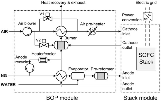 The study was conducted on a 10kW SOFC system, which consists of two interconnected modules, the balance of plant (BoP) and the stack. The layout of the system can be seen in Figure 12. It utilizes a single, planar, 80-cell SOFC stack powered by methane.