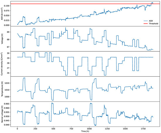 In Figure 13 and Figure 14, operational data of almost 1850h are presented. The system was operated in a non-stationary regime during which there were frequent changes in the load. Therefore, the stack voltage is not the best candidate for the health indicator. Instead, ASR was chosen as the health metric since it is invariant to changes in process variables (technically, we have chosen ASR0 as the metric according to (33)). For validation of the algorithm the threshold of ASR was set to mm2 (a red horizontal line in Figure 13).